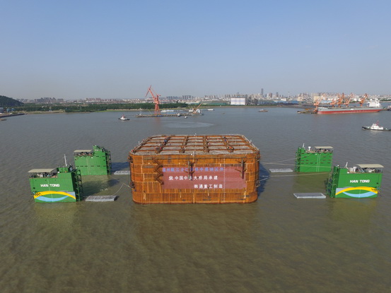 2017年5月16日4:38分,我司承接的中铁瓯江大桥钢沉井顺利下水。该沉井将通过14000吨半潜驳浮运至温州瓯江大桥工程现场下沉。并在锚地下沉起锚后于17日上午4:30拖航去温州,瓯江大桥沉井平面形状为圆角矩形,钢沉井总高 59m,钢沉井井身平面尺寸为 66m×55m,井身材料为 Q345C 钢材,总重18000吨。