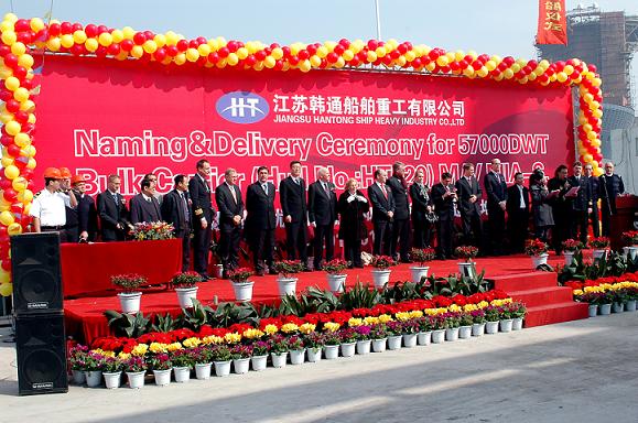2010年1月29日,韩通船舶重工有限公司为Schepers公司建造的第二艘57000吨散货轮(HT020)达到了交船状态,在韩通重工码头为该艘举行隆重的命名及交船仪式。Schepers航运公司 Rudolf Schepers 先生和Jan Schepers先生、圣母凯特琳· Schepers女士、中国航空技术厦门有限公司船舶部经理林昱先生、英国劳氏船级社中国中部地区技术总监杰弗· 凯夫先生、江苏韩通船舶重工有限公司总经理武亦文先生共同见证了这一激动人心的时刻,并发表了精彩的演讲。随后是船舶行业古老而传统的砸香槟仪式。它在国外由来以久,饱含着祝福和祈祷,预示着平安和吉祥。在大家倒数声中,圣母凯特琳· Schepers女士砍断缆绳,香槟四溅,音乐响起,礼花飞舞,鞭炮燃放,全场人员热烈鼓掌。最后由武总带领各嘉宾上船参观。