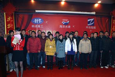 2010年2月8日晚,北辰大酒店宴会大厅灯火璀璨,流光溢彩,由韩通重工、海洋水建、中冶船舶、文景大酒店共同举办的,以“一路同行,感恩有你”为主题的迎春联欢晚会正在举行。欢快的音乐萦绕在耳畔,满场的红色衬托出喜庆的气氛,让整个会场笼罩在欢腾之中。晚会首先由孟董事长及四家公司高层领导进行了新春贺词,接着备受瞩目的优秀员工、优秀大学生、优秀班组、优秀施工单位和优秀施工班组奖项在晚会上相继颁出,此时在各工作岗位上辛勤工作了一年的同事们成了彩光灯下最耀眼的明星。晚会中现场抽奖让晚会气氛再次高涨,而特等奖液晶彩电的抽取更是将晚会的气氛推向了最高点。大家欢欣鼓舞,热情高涨,都沉浸在欢乐之中。