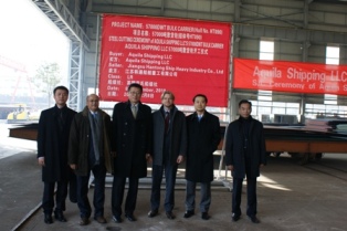 2010年12月8日上午10:30,在我司新船体车间举行57000吨散货轮(船体号:HT090)开工仪式,本船为Aquila Shipping LLC 建造的系列船的首制船,该船入LR船级社,计划于2011年10月31日交船。我司总经理武亦文先生,副总经理陈兴先生及船东船检代表参加了开工仪式。开工点火后,在韩通会议室签署了开工文件。