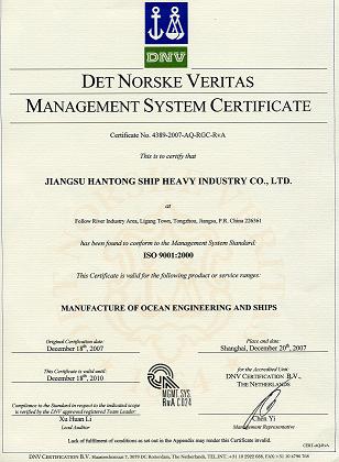 2008年1月,韩通船舶重工有限公司收到DNV签发的ISO9000的证书,是目前通过DNV认证的少数船厂之一。DNV相对于其他认证机构来说,比较严格和规范,对促进企业的发展提高是由极大的帮助的,同时也提升了企业的管理水平。